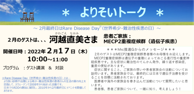 2月17日(木)にEAファーマ(株)社が行っている「よりそいトーク」にてMECP2重複症候群や家族会の活動などをお話させていただきました。