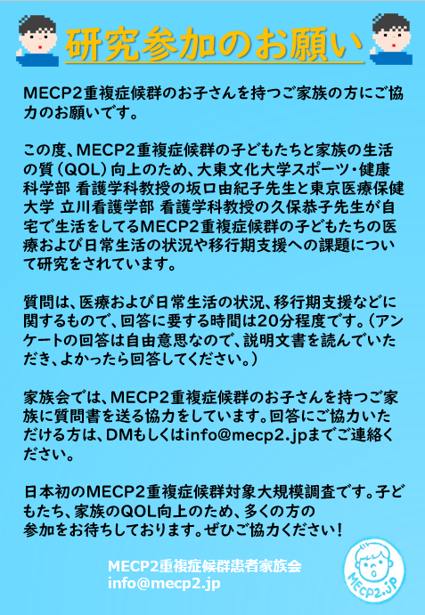 ご協力いただける方は、お手数ですがアンケートの発送をさせていただきますので、info@test.mecp2.jpまでメールをお送りいただくか、家族会公式SNSのDMにてご連絡ください。