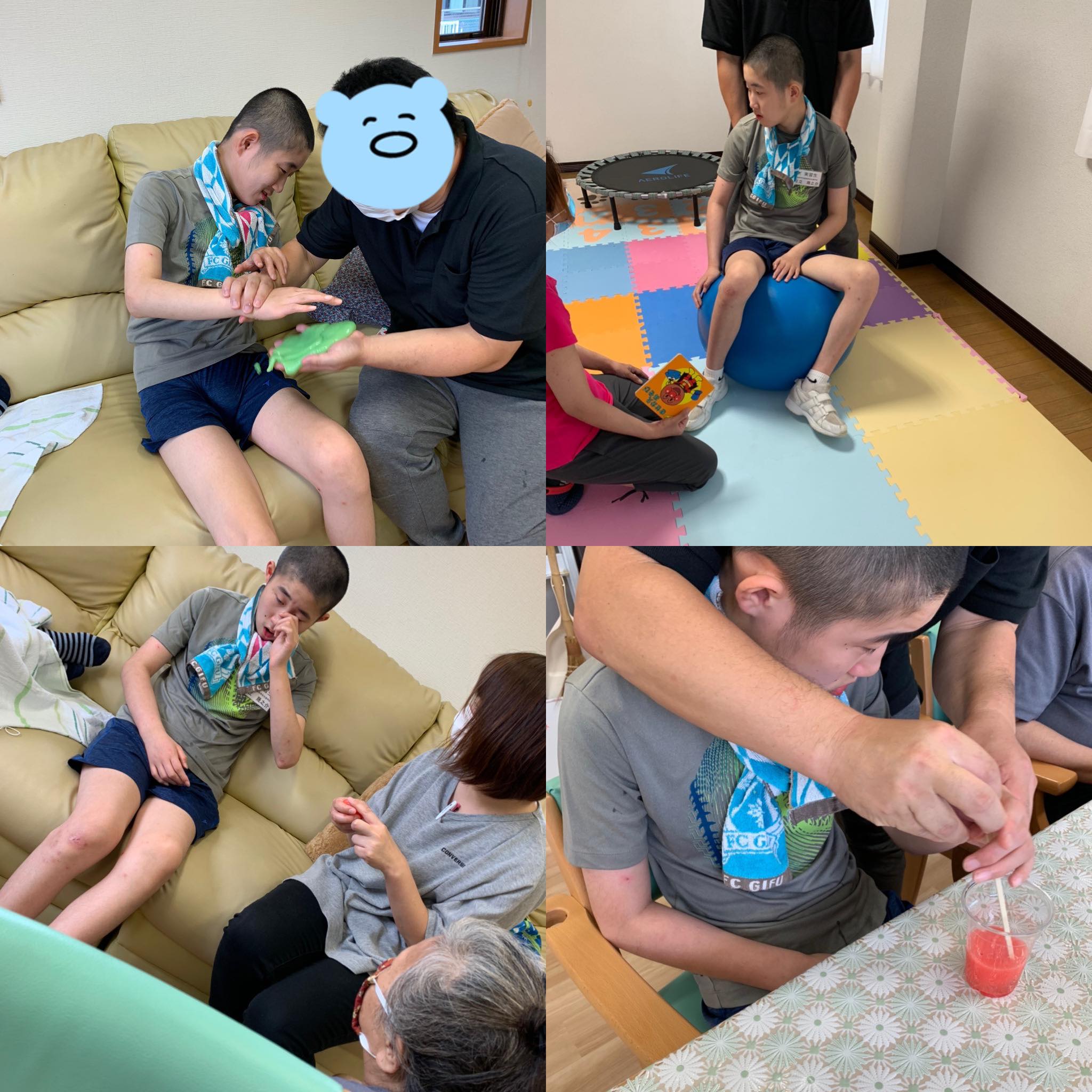 晟之介 (左:小学校1年生の夏祭り 右:最近のST 咀嚼のリハ 下:就業体験実習(生活介護施設) )